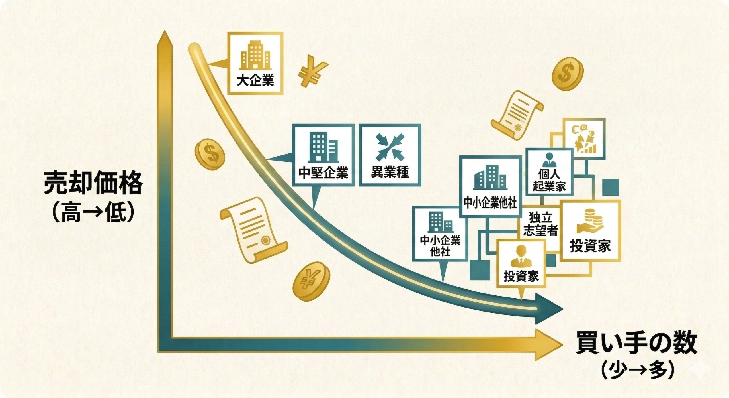 規模が小さいほど取得価格は相対的に低く、参加できる買い手の母数が広がります。「うちは小さいから売れない」ではなく、「うちは小さいからこそ買い手が集まりやすい」という見方もできるのです。