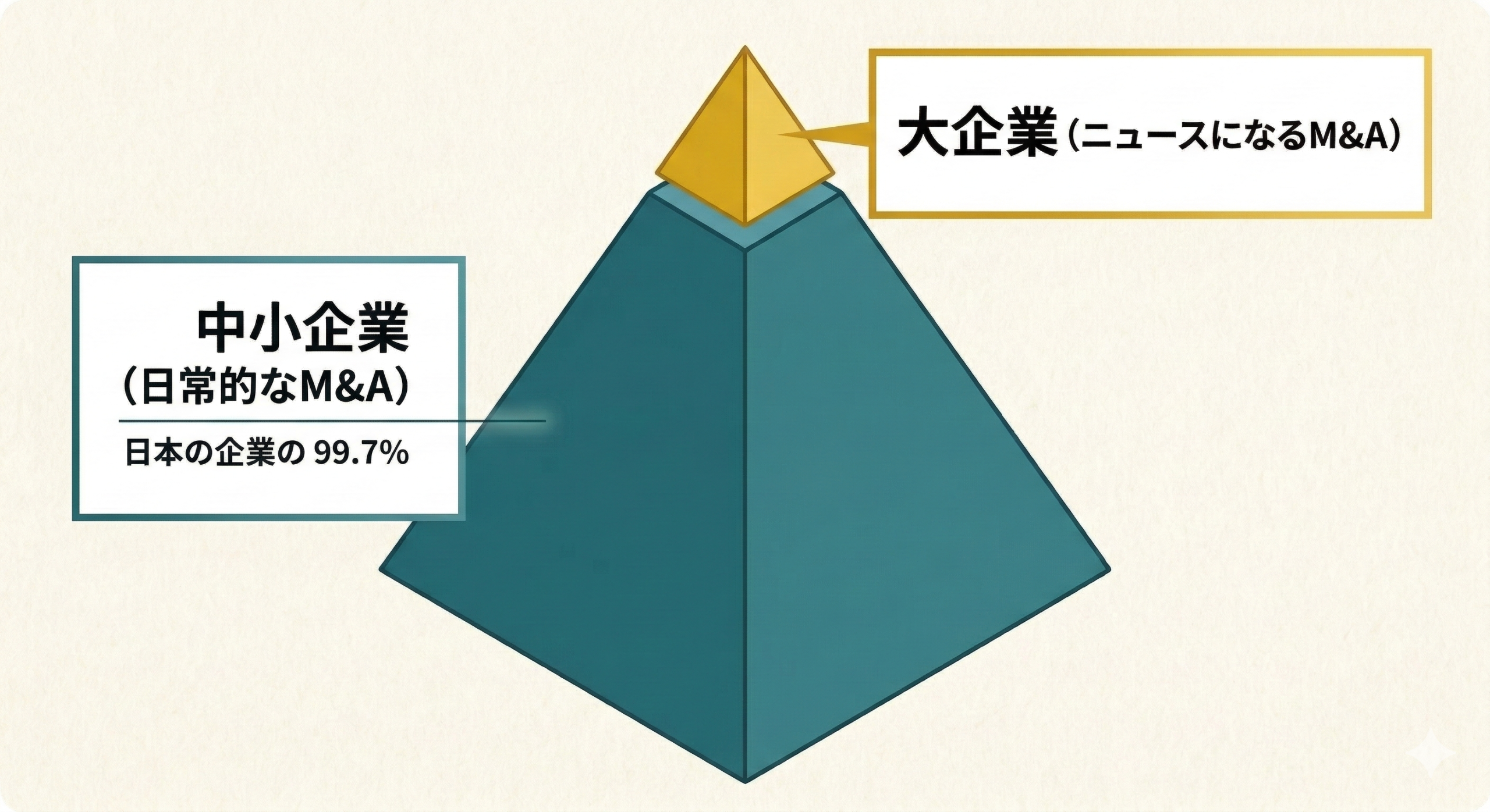 日本の全企業のうち99.7%は中小企業です(出典:総務省・経済産業省「令和3年経済センサス‐活動調査」)。M&Aの現場でも、取引の中心を担っているのは中小企業どうしの案件であり、大企業同士の大型買収はあくまで一部にすぎません。