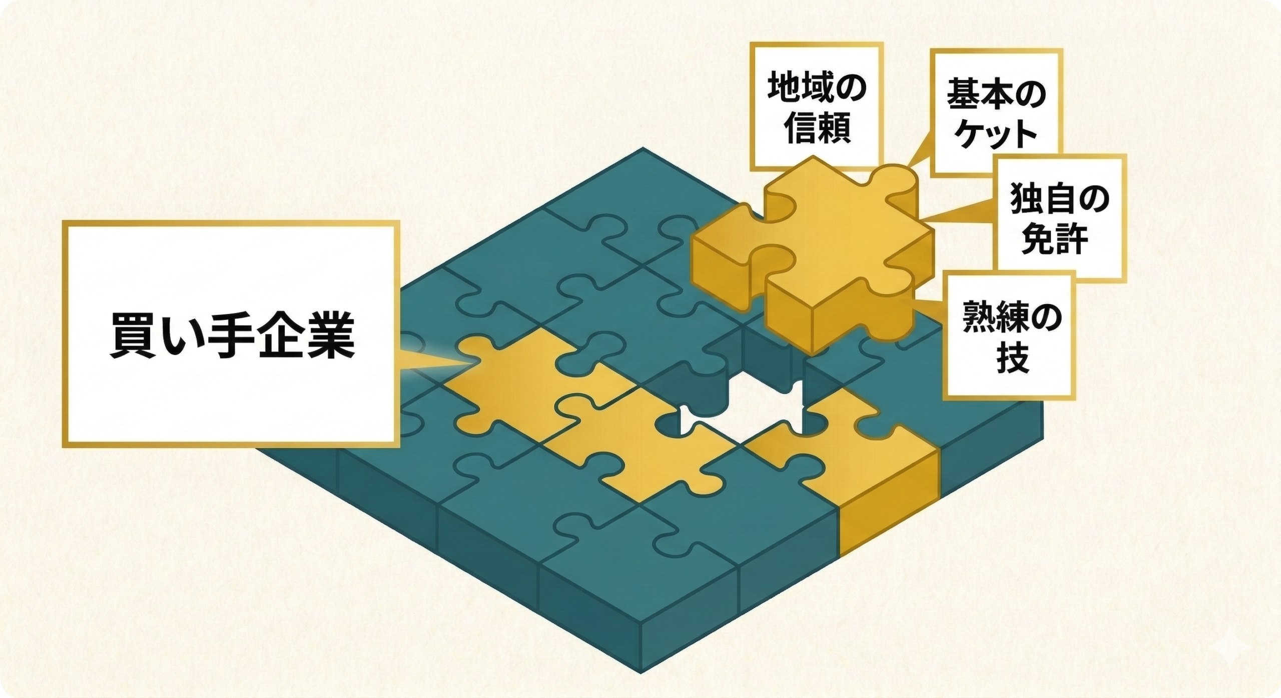 特定の地域でシェアを持つ企業、特定の業種で独自の技術・ノウハウを蓄積している企業は、大手が参入しにくい市場を押さえています。買い手の立場からすれば、そのような企業を買収することは「その市場への参入権を一括で手に入れること」を意味します。