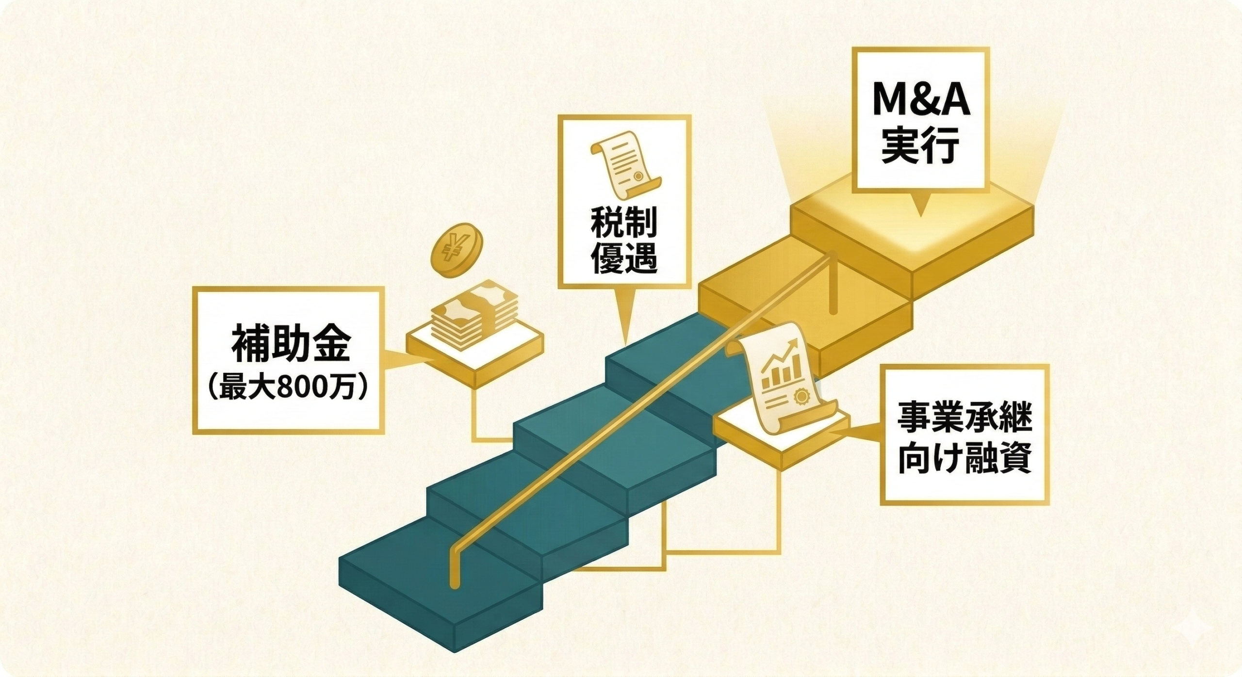 | 事業承継・引継ぎ補助金 | 最大800万円(補助率2/3) | M&A費用・専門家費用・設備投資など |