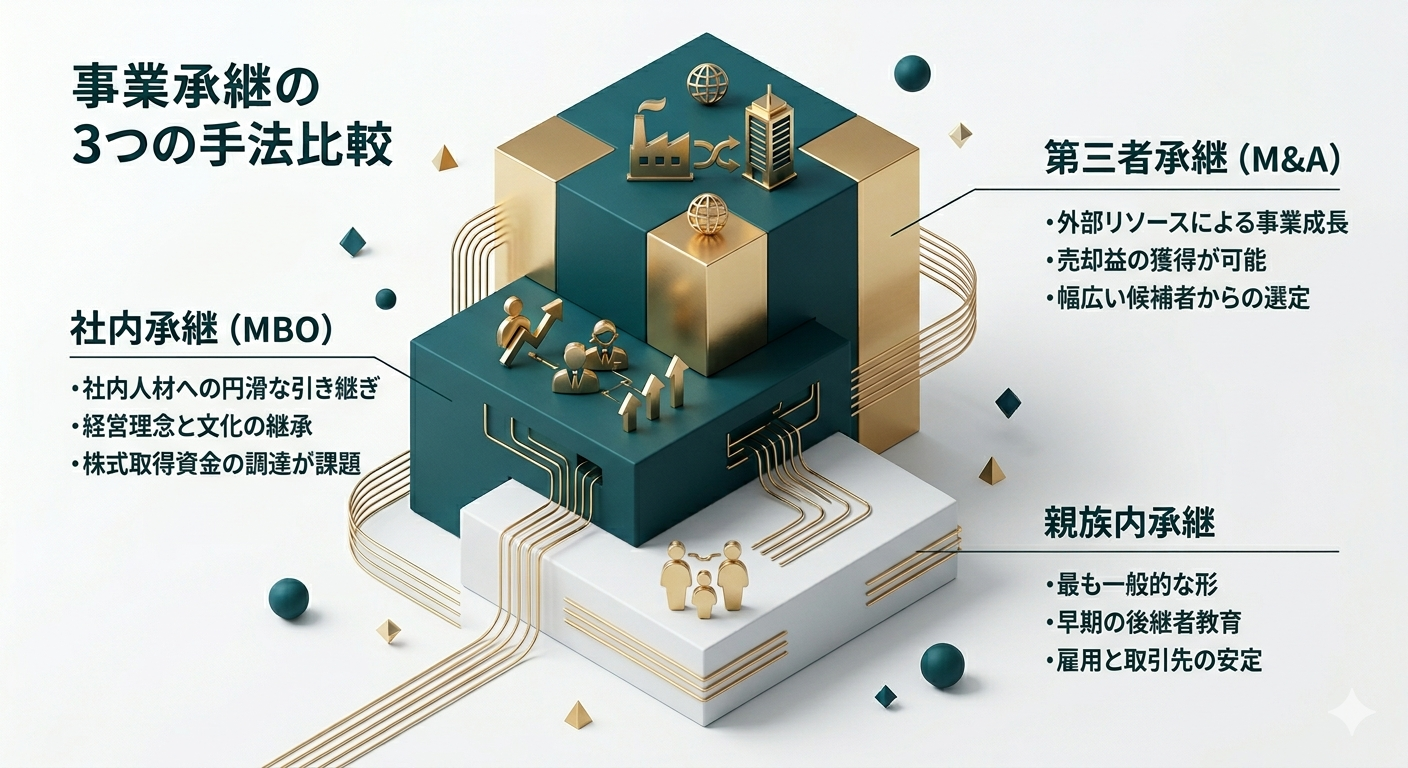 事業承継の方法は、大きく分けて3つあります。それぞれの違いを理解することが、自社に合った選択をするうえで大切な出発点となります。