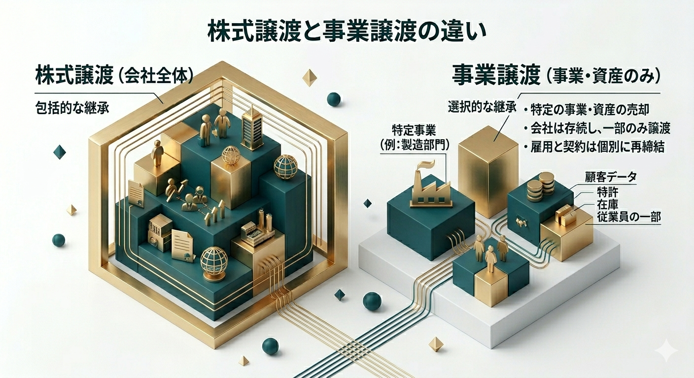 第三者承継(M&A)には、主に2つの手法があります。どちらを選ぶかによって、売却後に引き継がれる権利・義務の範囲が大きく変わります。それぞれの特徴を整理しましょう。